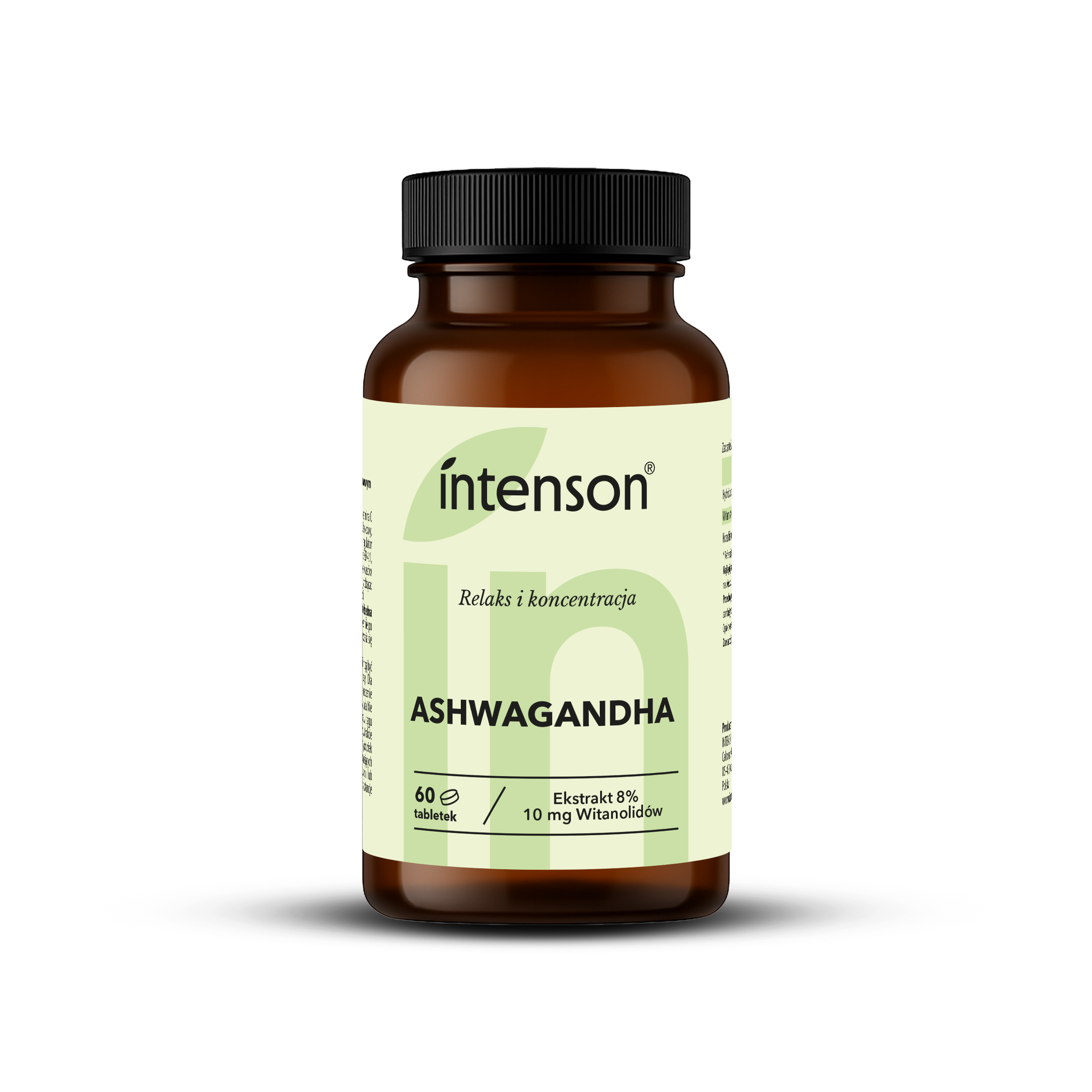 Intenson Ashwagandha 10 mg witanolidów to naturalny suplement roślinny wspierający równowagę organizmu i dobre samopoczucie. Zawiera wysokiej jakości ekstrakt z korzenia Withania somnifera L., standaryzowany na zawartość 8% witanolidów. Dzięki temu każda porcja dostarcza 10 mg tych cennych związków aktywnych, które wspierają odprężenie, koncentrację oraz witalność organizmu.