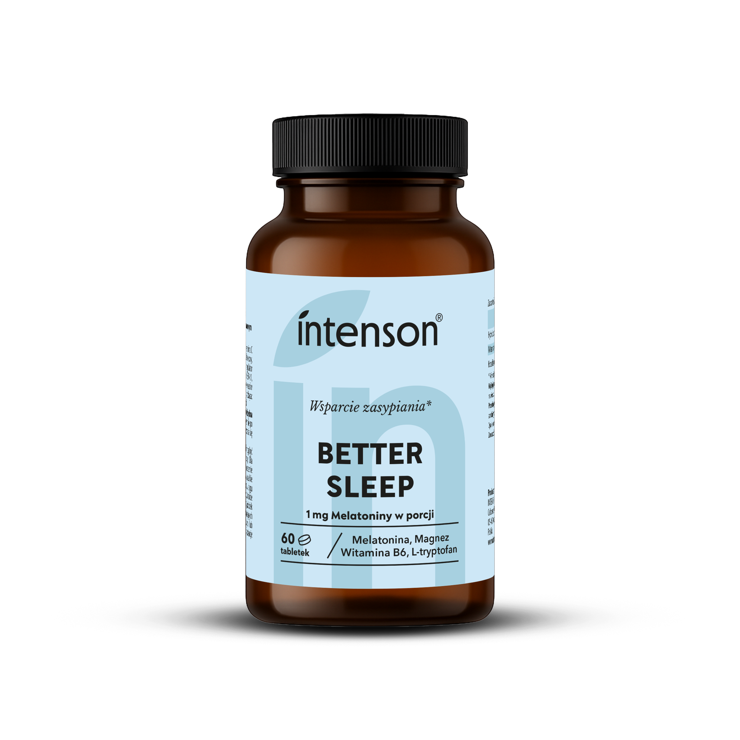 Intenson Better Sleep to suplement diety stworzony z myślą o osobach, które chcą zadbać o jakość snu i naturalny rytm dobowy. Każda tabletka zawiera 1 mg melatoniny, wspierającej prawidłowy proces zasypiania, oraz kompleks składników: magnez, witaminę B6, L-tryptofan i ekstrakty roślinne DailyZz™ z mięty i zielonej herbaty, które poprawiają jakosć snu.