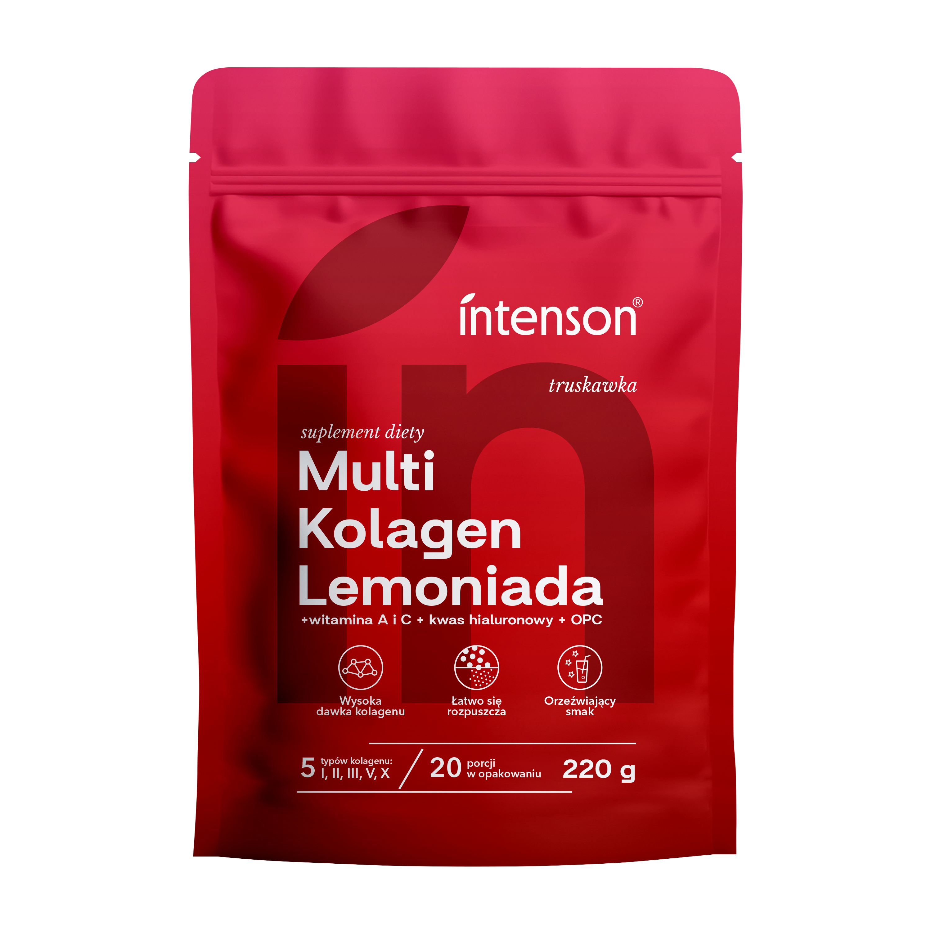 Intenson Multikolagen Limonada to hydrolizowany kolagen składający się z 5 typów kolagenu: I, II, III, V, X w formie proszku o orzeźwiającym smaku lemoniady truskawkowej. Bez dodatku cukru, słodzony erytrytolem i aromatyzowany naturalnie. Idealny jako dodatek do codziennej, zbilansowanej diety osób aktywnych. Kolagenowa lemoniada – codzienny rytuał piękna i świeżości. Połączenie 5 typów kolagenu w lekkiej, orzeźwiającej formule, która uzupełnia Twoją pielęgnację od wewnątrz.